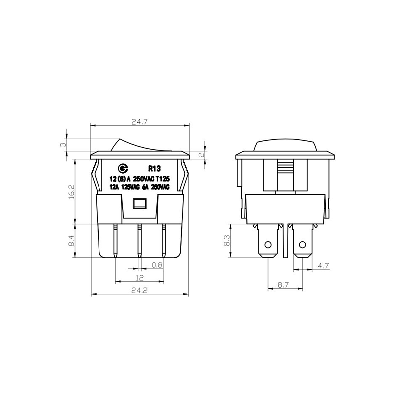 Funzionalmente, l'interruttore a bilanciere R13-31 adotta un design ad azione momentanea che fornisce un funzionamento regolare e un feedback tattile chiaro, garantendo affidabilità nell'uso prolungato. Alcuni modelli includono anche un indicatore LED per una rapida conferma visiva dello stato dell'interruttore. I pin terminali sono connettori metallici standard, che rendono l'installazione semplice e compatibile con un'ampia gamma di configurazioni di cablaggio.